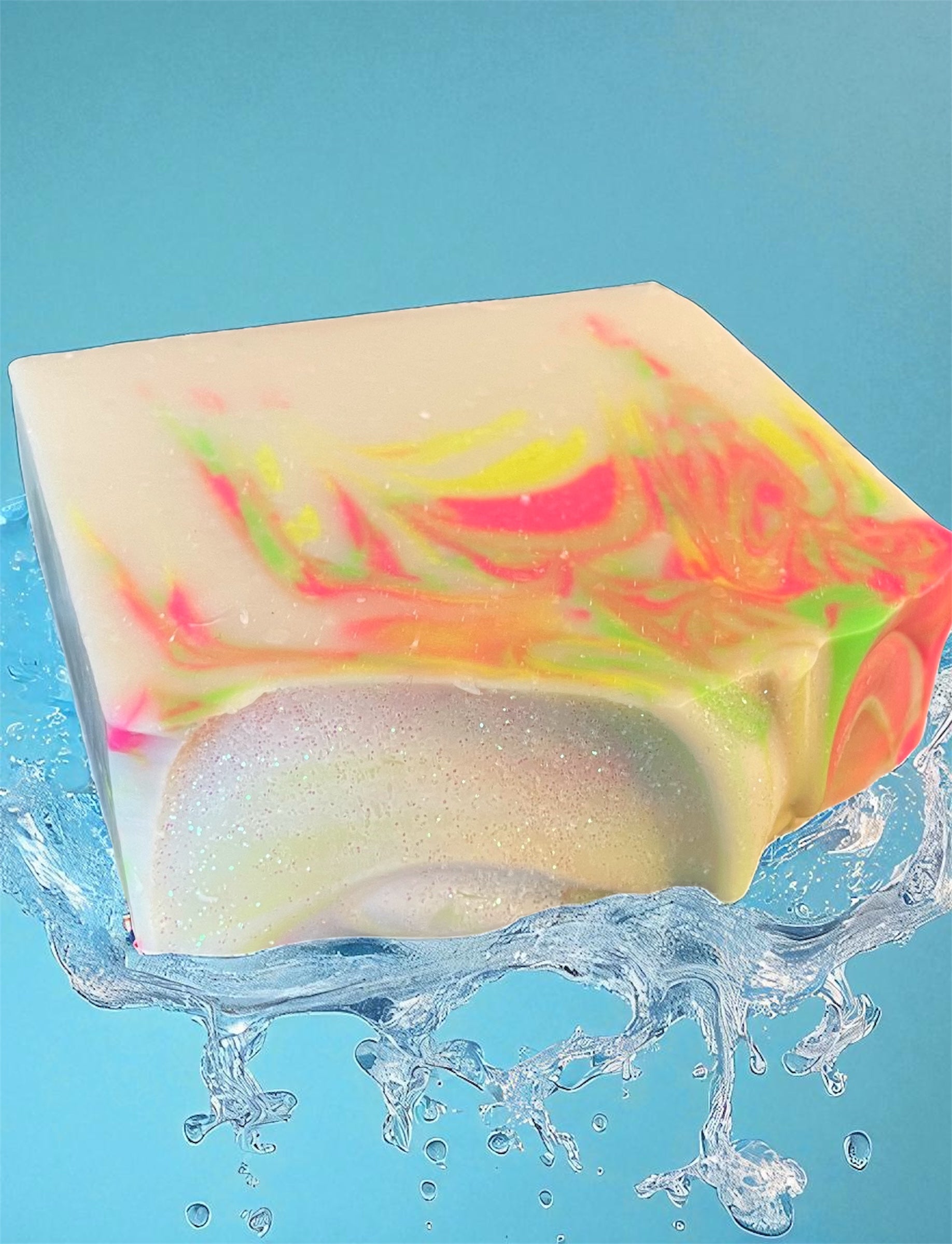 Made with the Sodium Hydroxide saponification of Olive Oil, Sustainable Palm Oil, Coconut and Sweet Almond Oils, Shea Butter for creaminess, Sodium Lactate to bar hardiness, Mica for colors, a little sprinkle of glitter on top and a premium soap Fragrance Oil that will make your day bright.