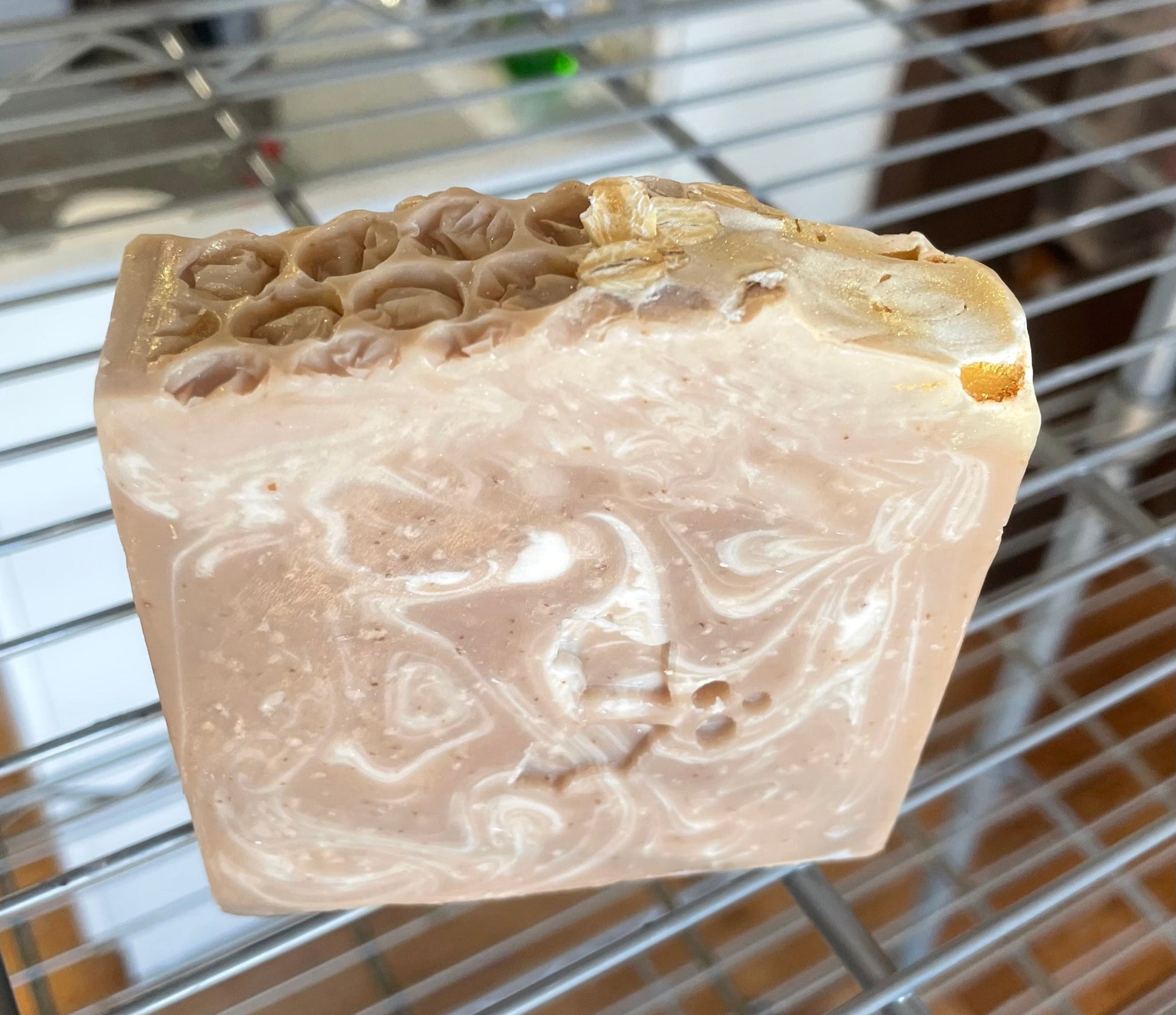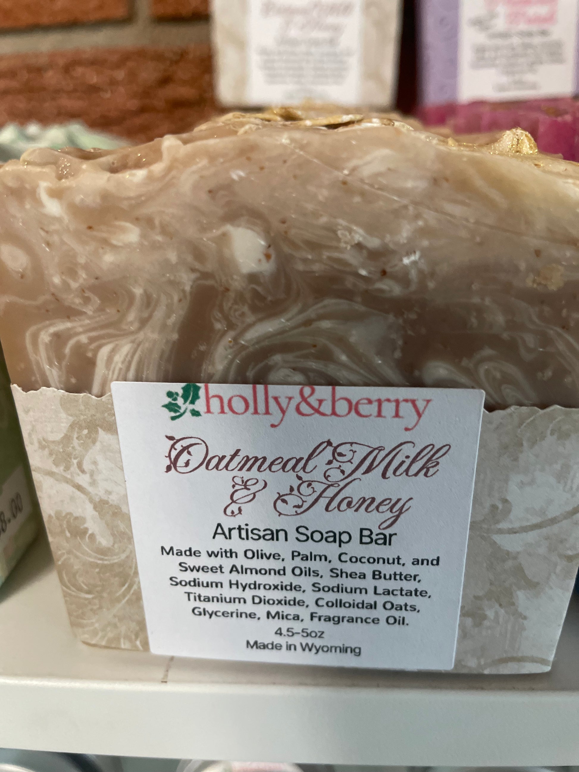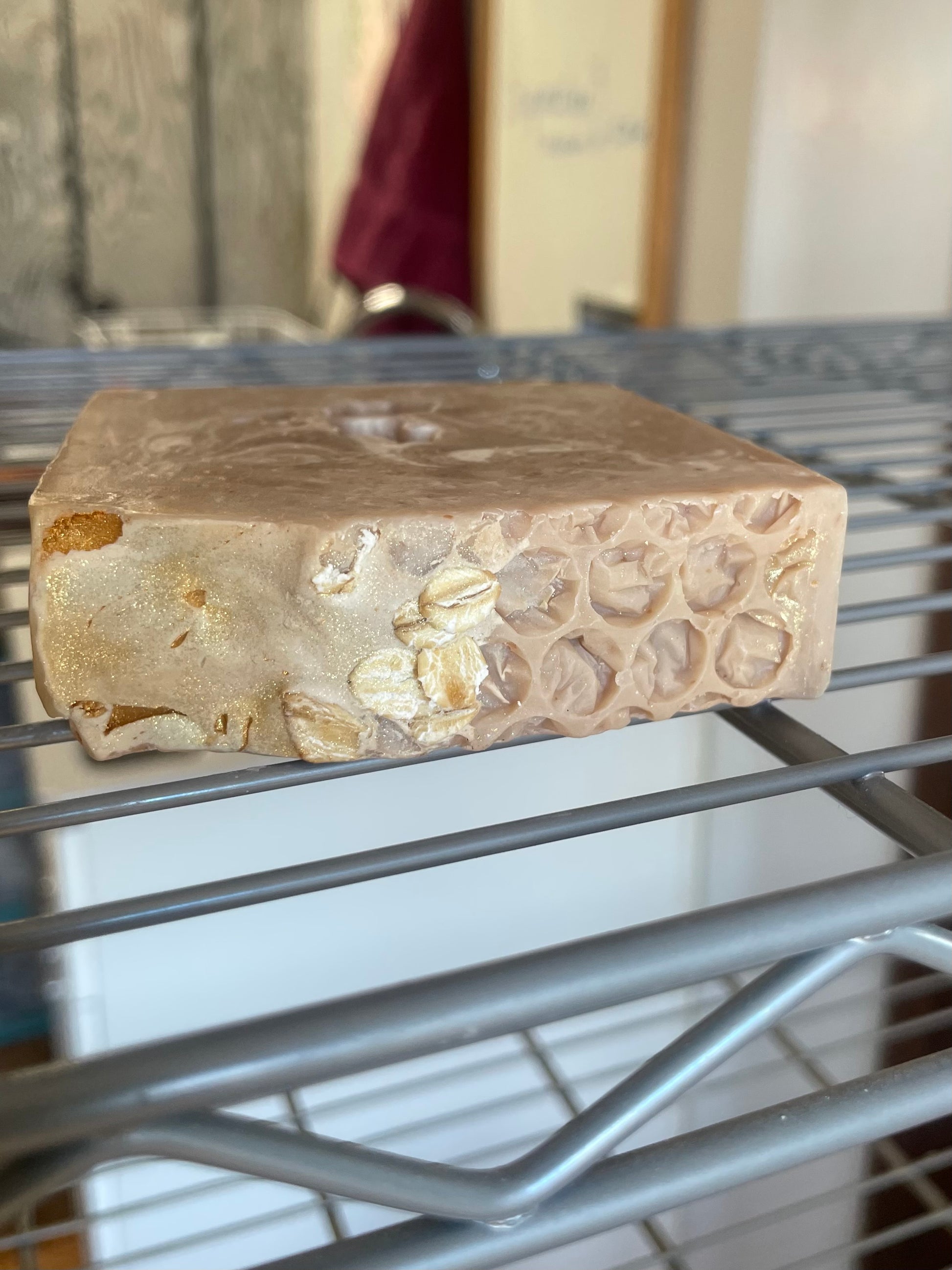 Approx 6 oz bar of goodness with a beautiful golden sheen on top made with Olive Oil, Sustainable Palm Oil, Coconut Oil, Sweet Almond Oil, Shea Butter, Sodium Hydroxide for saponification process, Sodium Lactate, a salt for bar hardiness, Titanium Dioxide for soap coloring, Colloidal Oatmeal in bar and whole oats sprinkled on top, glycerin, mica, and a premium soap fragrance oil.